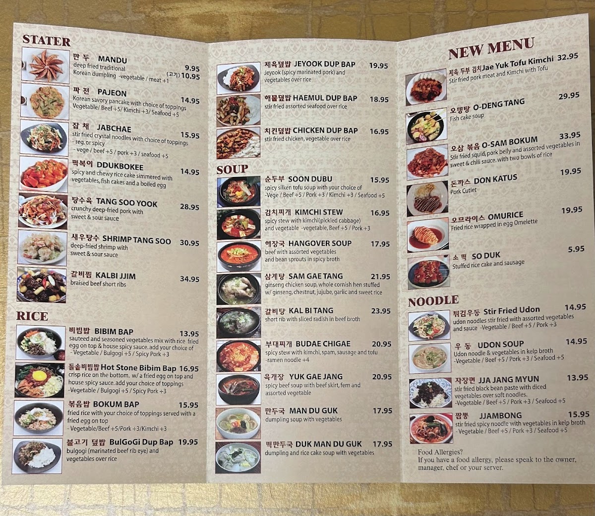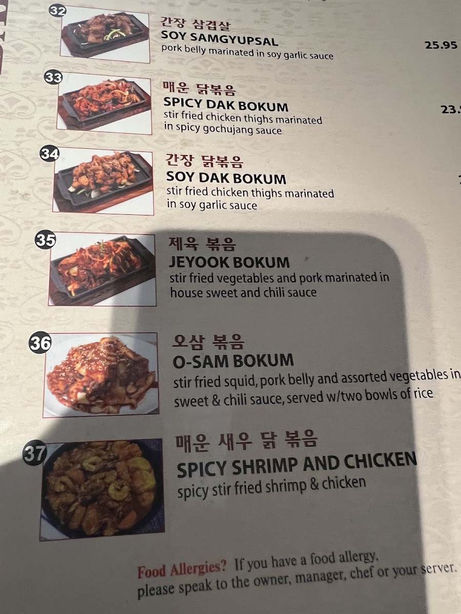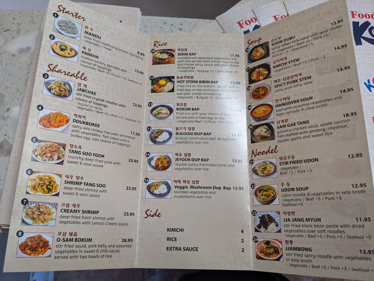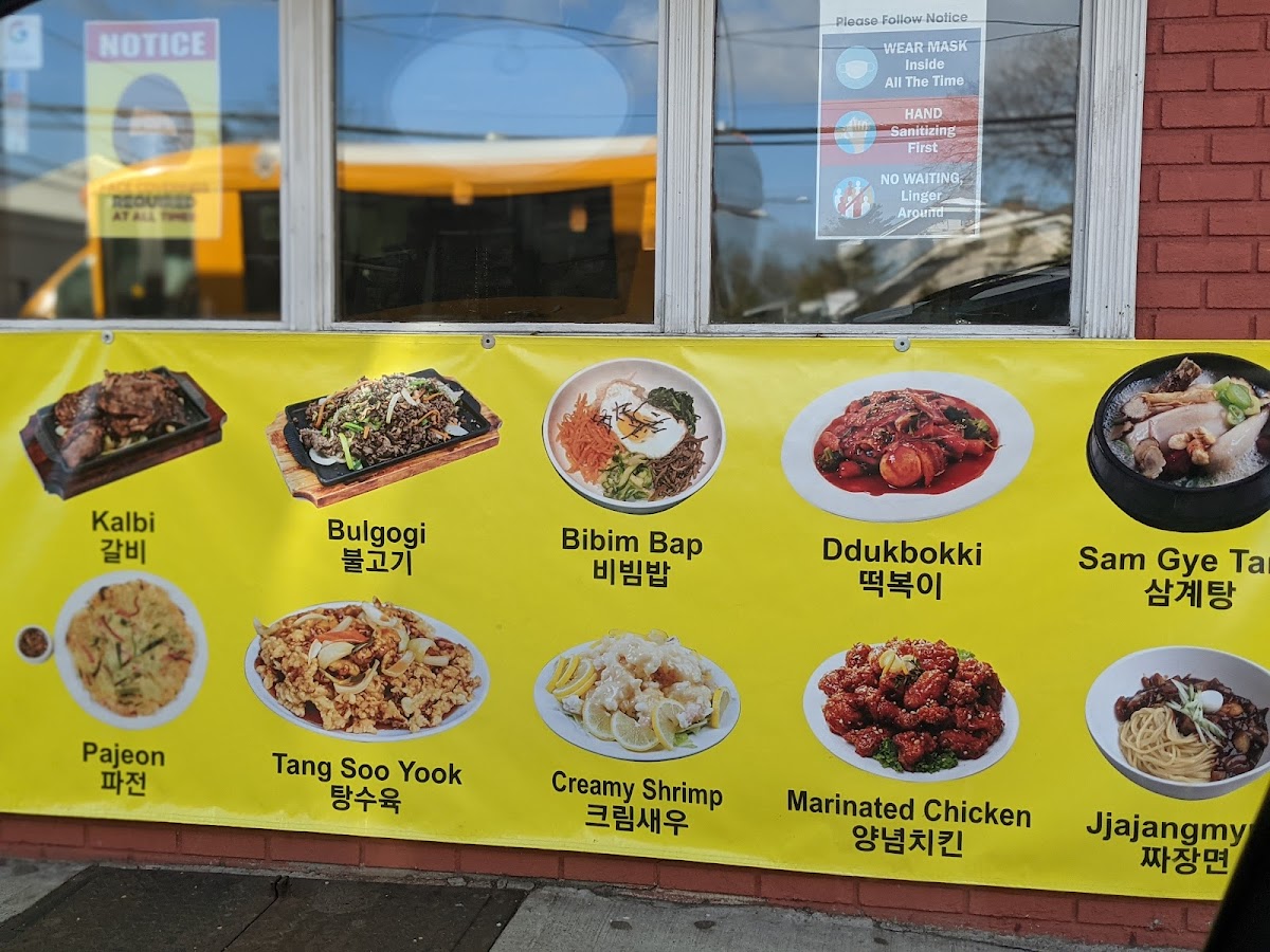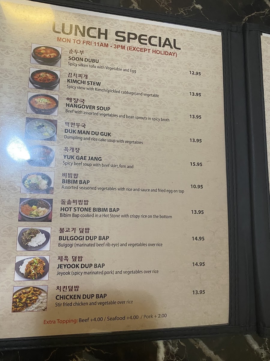 Rice Dishes: The rice options include Bibim Bap, a mixed vegetable and egg bowl served with house spicy sauce and choice of toppings like vegetable, bulgogi (marinated beef), or spicy pork, as well as Hot Stone Bibim Bap served on crispy rice. These dishes provide hearty and customizable meal choices.