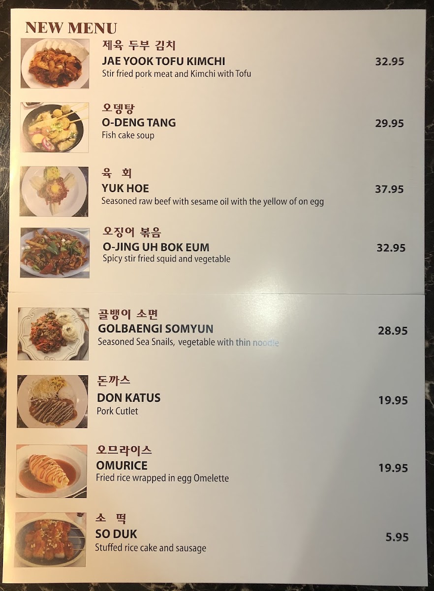 This menu suits casual dining occasions and allows for quick ordering or sharing among groups. It covers a variety of textures and flavors typical of Korean cuisine, from spicy and savory to mild and refreshing, catering to diverse preferences.